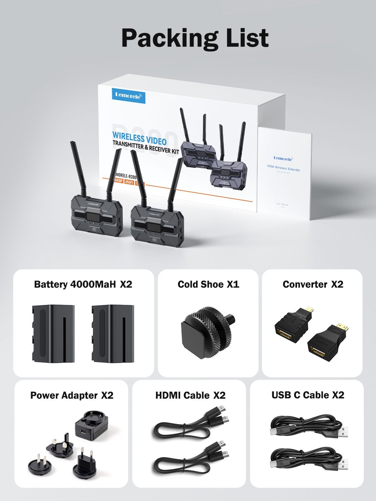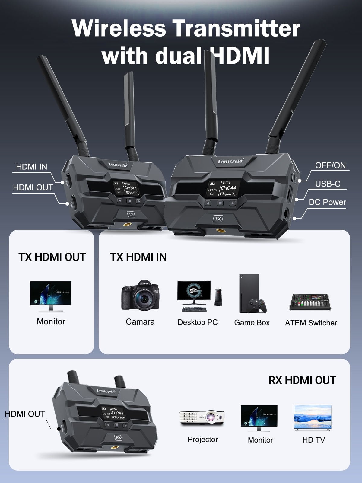 Lemorele R200 Wireless HDMI & USB-C Kit, fotoğraf ve video prodüksiyonlarından çoklu ekran kurulumlarına kadar geniş kullanım alanına hitap eden, kablosuz görüntü aktarımı için geliştirilmiş pratik ve güçlü bir çözümdür. HDMI ve Type-C bağlantı desteği sayesinde farklı kaynak cihazlarla daha esnek çalışır. 1080P 60Hz Full HD görüntü aktarımı, 5.8GHz kablosuz bağlantı yapısı ve düşük gecikmeli performansı ile set ortamlarında, etkinlik alanlarında ve profesyonel sunum kurulumlarında temiz ve düzenli bir iş akışı sağlar.