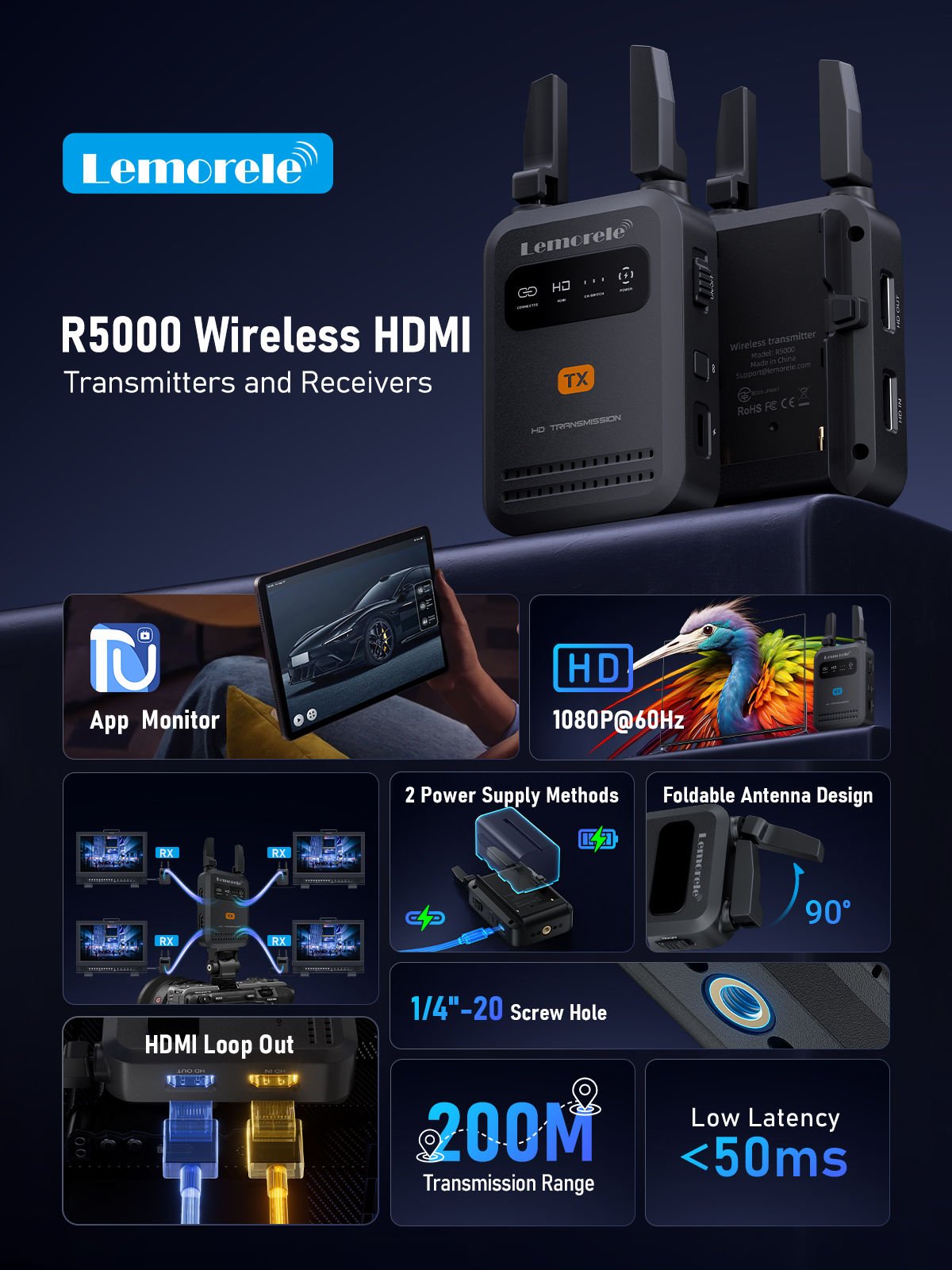 Lemorele R5000, açık alanlarda 200 metreye kadar kablosuz HDMI görüntü aktarımı sunarak geniş alanlarda özgür kullanım imkânı sağlar. Büyük ofisler, etkinlik alanları, sahne kurulumları veya çok odalı sistemlerde güvenilir bir bağlantı kurmanıza yardımcı olur.