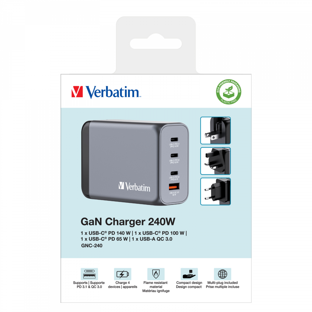 Verbatim'in 240W GaN Duvar Şarj Cihazı, bir USB-C PD 140W bağlantı noktası, bir USB-C PD 100W bağlantı noktası, bir USB-C PD 65W bağlantı noktası ve bir USB-A QC 3.0 bağlantı noktasını şık, avuç içi büyüklüğünde bir tasarımda birleştirir. Dizüstü bilgisayarınıza, tabletinize, akıllı telefonunuza, oyun cihazlarınıza ve daha fazlasına güç sağlamak için ofis, ev veya seyahat için idealdir. Katlanabilir ABD uçları ve değiştirilebilir AB ve BK fişleri ile mükemmel bir seyahat arkadaşıdır.